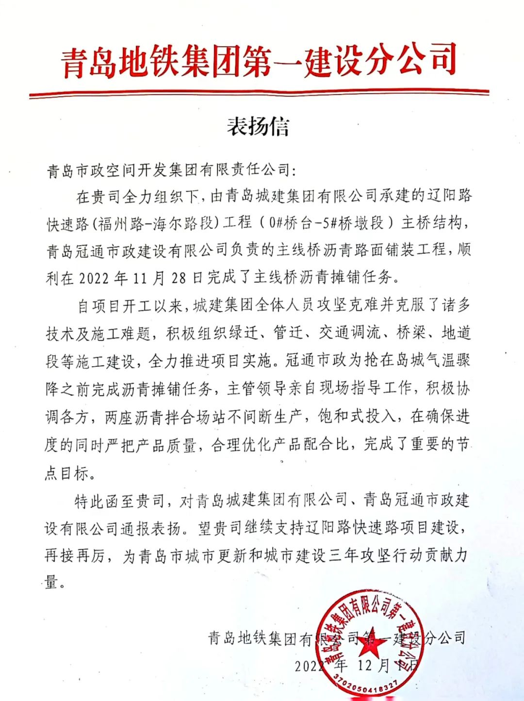 日前,青島市政空間開發(fā)集團(tuán)收到了兩封來自青島地鐵集團(tuán)和青島動車小鎮(zhèn)投資集團(tuán)的表揚(yáng)信和賀電,讓我們一起來看看吧。2022-12-09 -