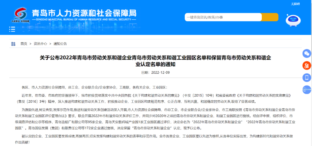 喜報(bào)!集團(tuán)及子分公司榮獲2022年青島市勞動關(guān)系和諧企業(yè)稱號