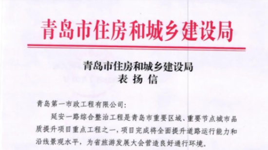 一封來自青島市住房和城鄉(xiāng)建設(shè)局的表揚信