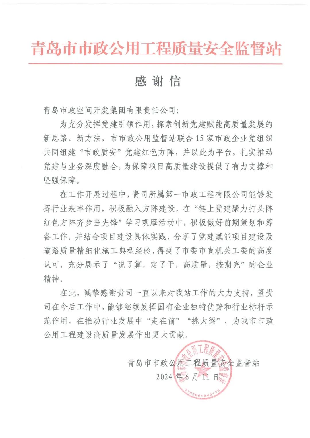 一封來自青島市市政公用工程質(zhì)量安全監(jiān)督站的感謝信