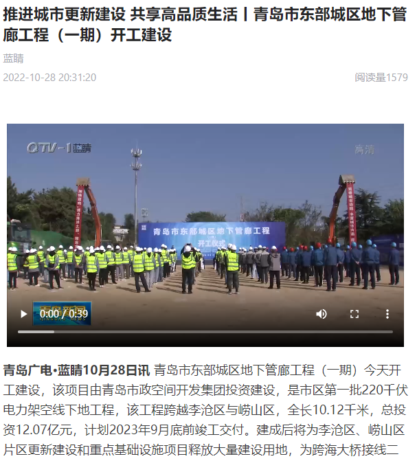 【青島新聞】推進城市更新建設(shè) 共享高品質(zhì)生活丨青島市東部城區(qū)地下管廊工程(一期)開工建設(shè)