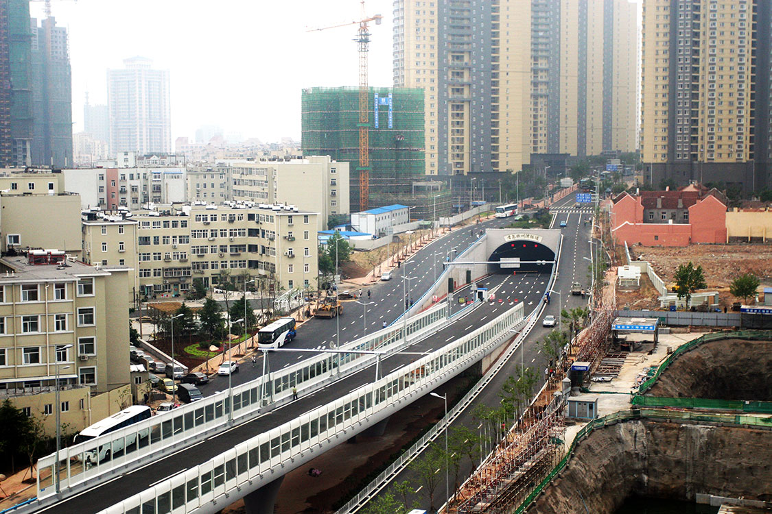 膠州灣灣口海底隧道青島端接線工程南起膠州灣灣口海底隧道青島端終點,分別沿四川路、云南路向北,在東平路路口爬升地面后開始高架,于山西路路口上方合流后接入快速路三期工程。