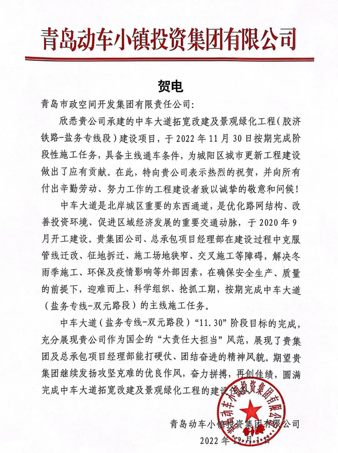 青島動車小鎮(zhèn)投資集團發(fā)來賀電,向青島市政空間開發(fā)集團所屬第一市政承建的中車大道項目完成階段性任務,具備主線通車條件,表示熱烈祝賀。賀電指出,中車大道項目階段目標的完成,充分展現(xiàn)了青島市政空間開發(fā)集團作為國企的“大責任大擔當”風范,展現(xiàn)了能打硬仗、團結奮進的精神面貌,為城陽區(qū)城市更新工程建設作出了應有貢獻。