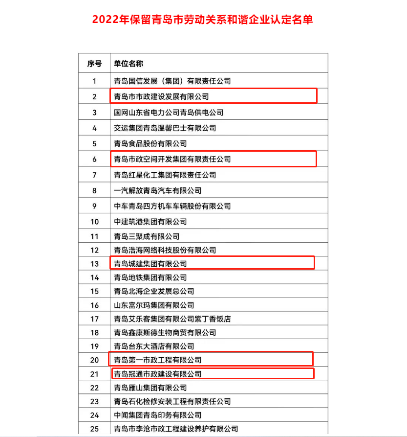 近日,青島市人力資源和社會(huì)保障局發(fā)布了《 關(guān)于公布2022年青島市勞動(dòng)關(guān)系和諧企業(yè)青島市勞動(dòng)關(guān)系和諧工業(yè)園區(qū)名單和保留青島市勞動(dòng)關(guān)系和諧企業(yè)認(rèn)定名單的通知》,青島市政空間開(kāi)發(fā)集團(tuán)及第一市政、城建公司、冠通市政、市政發(fā)展榜上有名,繼續(xù)保留“青島市勞動(dòng)關(guān)系和諧企業(yè)”認(rèn)定,為進(jìn)一步優(yōu)化創(chuàng)建和諧勞動(dòng)關(guān)系提供了有力認(rèn)證和堅(jiān)實(shí)信心。