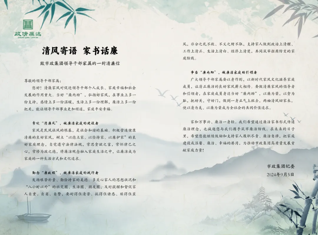 活動結(jié)束時(shí),集團(tuán)紀(jì)委通過發(fā)放《致市政集團(tuán)領(lǐng)導(dǎo)干部家屬的一封清廉信》傳遞廉潔理念,并誠邀干部家屬們與集團(tuán)紀(jì)委共同筑牢廉潔防線,當(dāng)好 “廉內(nèi)助”,常吹 “廉政風(fēng)”,常念 “廉政經(jīng)”,筑牢拒腐防變的 “家庭堡壘”,共同守好 “廉潔門”,為推動集團(tuán)高質(zhì)量發(fā)展貢獻(xiàn)家庭力量。