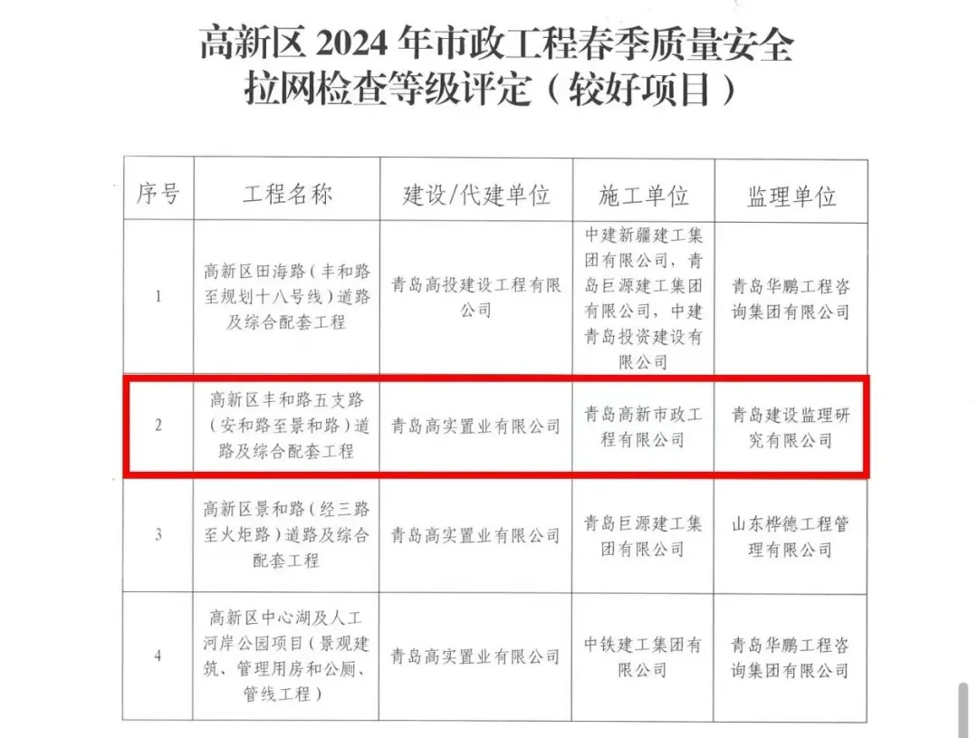 近日,青島市高新區(qū)建設(shè)部組織開(kāi)展2024年市政工程春季質(zhì)量安全拉網(wǎng)檢查總結(jié)表彰大會(huì),高新市政承建的高新區(qū)豐和路五支路道路及綜合配套工程獲表彰。