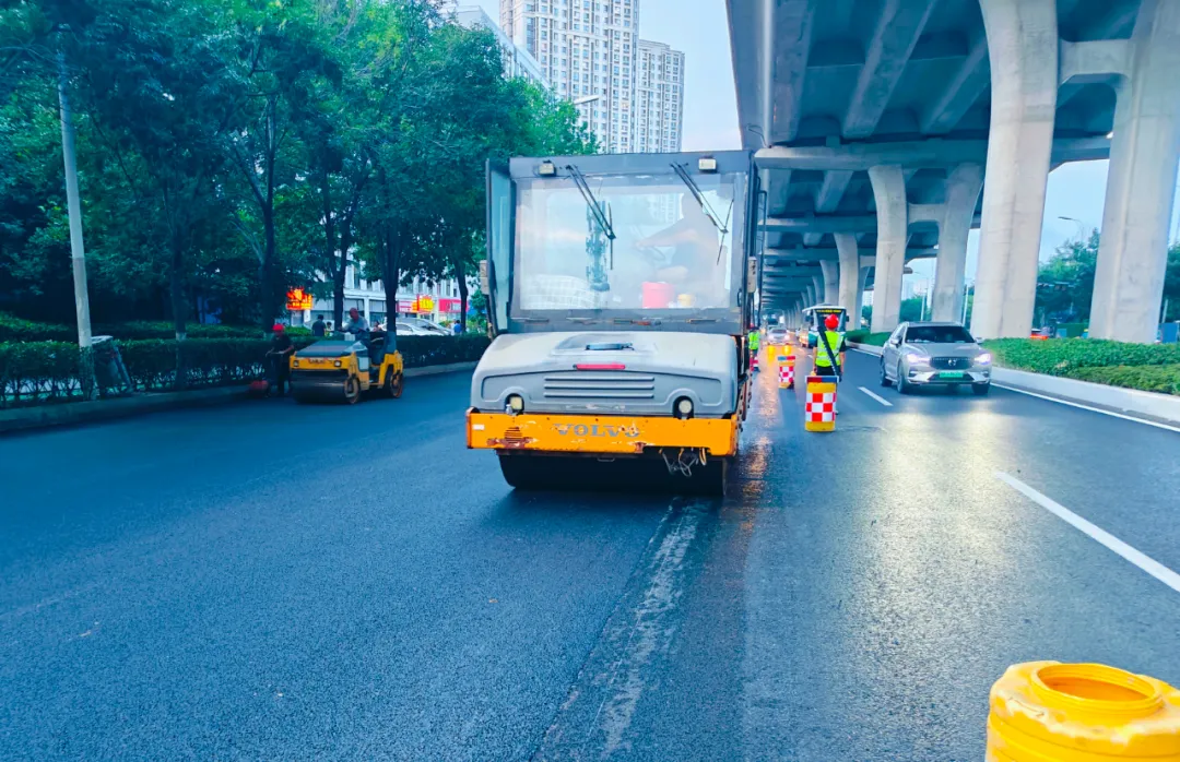 為安全、優(yōu)質(zhì)、高效完成此次攤鋪施工任務(wù),項目部超前謀劃、精心組織、科學(xué)安排,從瀝青拌和、運輸、攤鋪到碾壓等各環(huán)節(jié)入手,對瀝青混合料溫度、攤鋪厚度等數(shù)據(jù)進行實時監(jiān)測,確保瀝青攤鋪高效有序推進,有力地保障了瀝青面層的總體施工質(zhì)量。截至施工結(jié)束,累計完成車行道瀝青攤鋪37451平方米。